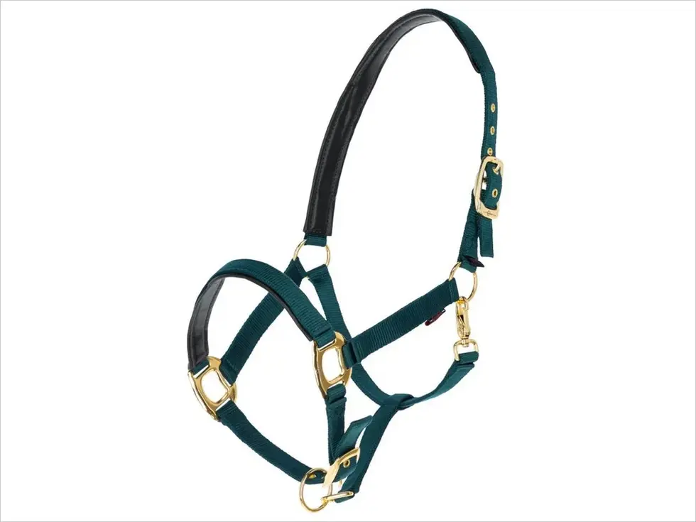 Têtière et muserolle réglables grâce à une boucle ardillon, montants et sous gorge de qualité, en matériau résistant à l'usure, avec coutures solides, Montants et muserolle à triple couture, bouclerie esthétique et résistante, ouverture et fermeture pratique du licol par mousqueton