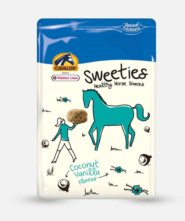 Cavalor Sweeties est un snack goût de coco et de vanille pour chevaux. Les snacks extrudés sont faciles à digérer et assimiler.